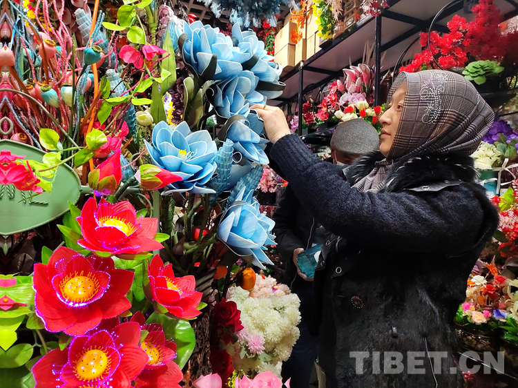 “我家店里客人挺多的,尤其這幾天,首先是因?yàn)槲覀兊幕ǚN齊全,應(yīng)有盡有,價(jià)格也實(shí)惠,其次我們之間能進(jìn)行簡(jiǎn)單的溝通,我會(huì)一些日常簡(jiǎn)單的藏語,他們也會(huì)說一些漢語。所以挺受大家歡迎?!蹦履不ǚ坷习迥擦岣吲d地說。