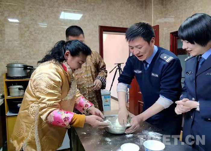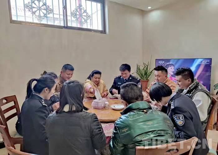 廚房里香味四溢,叔叔阿姨正在熬制古突(一種用牦牛肉湯熬煮的面食),民警們和面、搓面疙瘩,大家有說(shuō)有笑分享著過(guò)藏歷新年的喜悅。“你們過(guò)年也要堅(jiān)守崗位,今天咱們就一起吃‘古突’開(kāi)開(kāi)心心過(guò)個(gè)年。一會(huì)咱們還要在面疙瘩里包辣椒、毛線(xiàn)、羊毛、硬幣等9樣?xùn)|西。吃到這些東西的人要即時(shí)吐出。”民警們聽(tīng)到白瑪阿姨講的這些感到十分有趣。