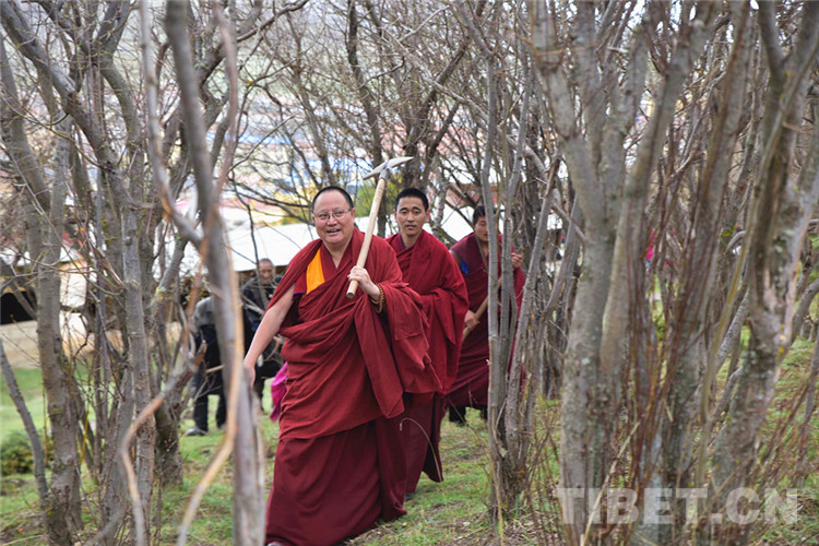 圖為達(dá)扎委員帶領(lǐng)達(dá)扎寺僧人和當(dāng)?shù)厝罕娭矘?shù)造林