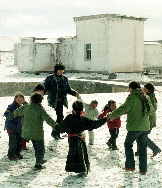這是青藏公路線上的唐古拉山道班小學(xué)師生,在課間活動(dòng)中跳起“鍋莊”舞(唐召明1990年攝)