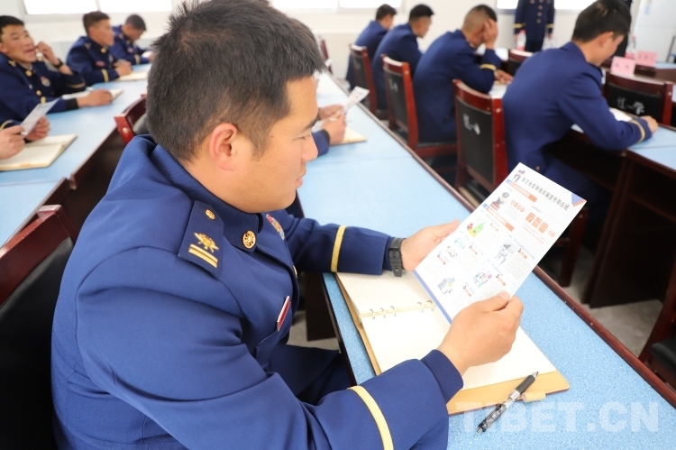 圖為該中隊隊員認真閱讀防范電信網(wǎng)絡(luò)詐騙宣傳手冊