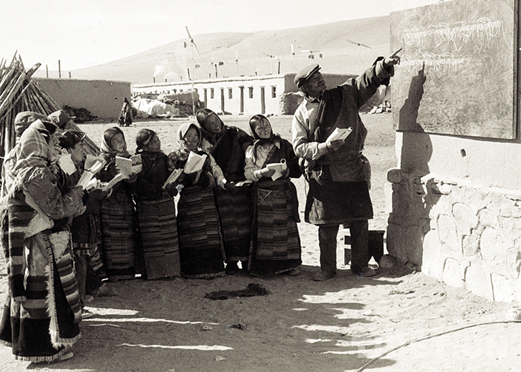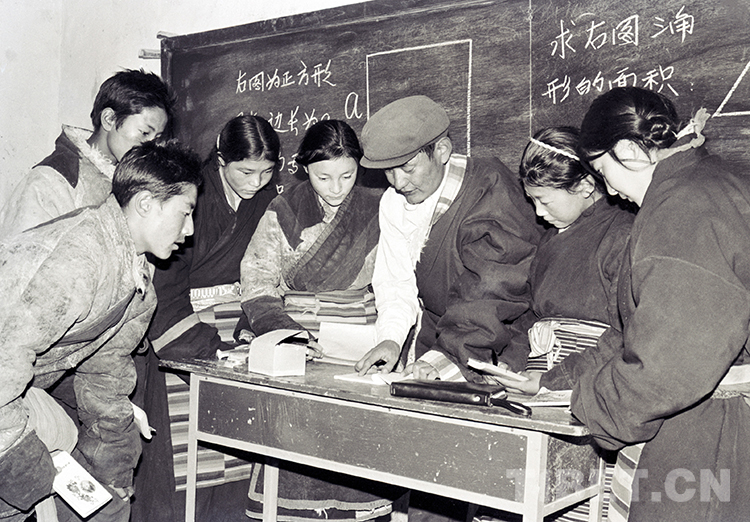 這是班戈縣小學(xué)校長(zhǎng)申卻堅(jiān)村在給學(xué)生上課(唐召明1987年攝)