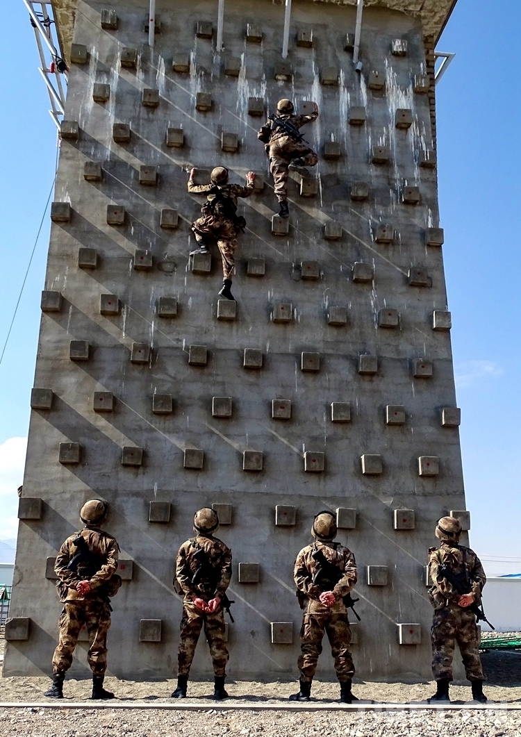 圖為阿里軍分區(qū)某部官兵進行攀巖訓練