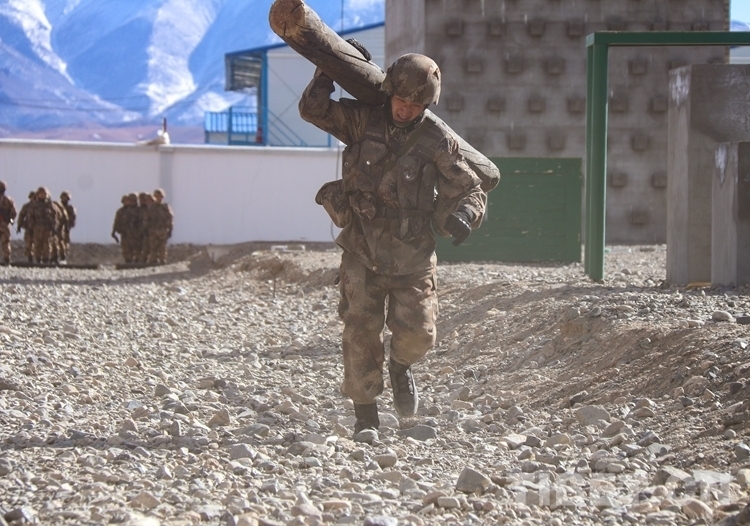 圖為阿里軍分區(qū)某部官兵進行負重訓練