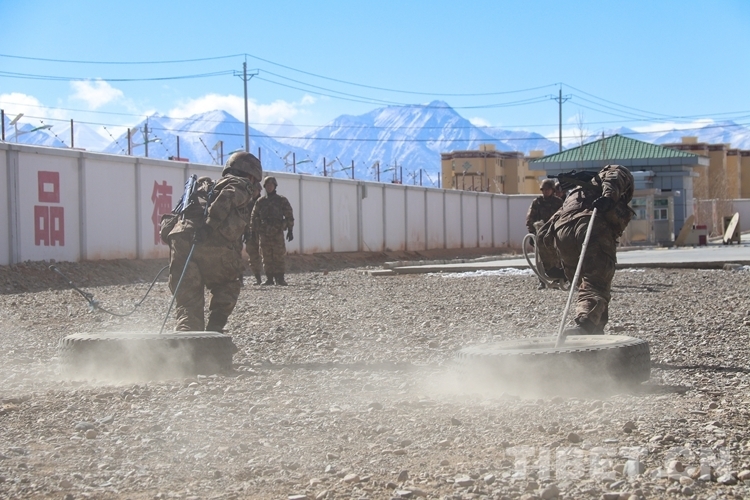 圖為阿里軍分區(qū)某部官兵進行拉輪胎訓練