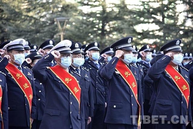 圖為2022年1月10日上午,西藏自治區(qū)公安廳組織民警迎接第二個中國人民警察節(jié)?,F(xiàn)場,全體民警舉右拳進(jìn)行人民警察誓詞宣誓
