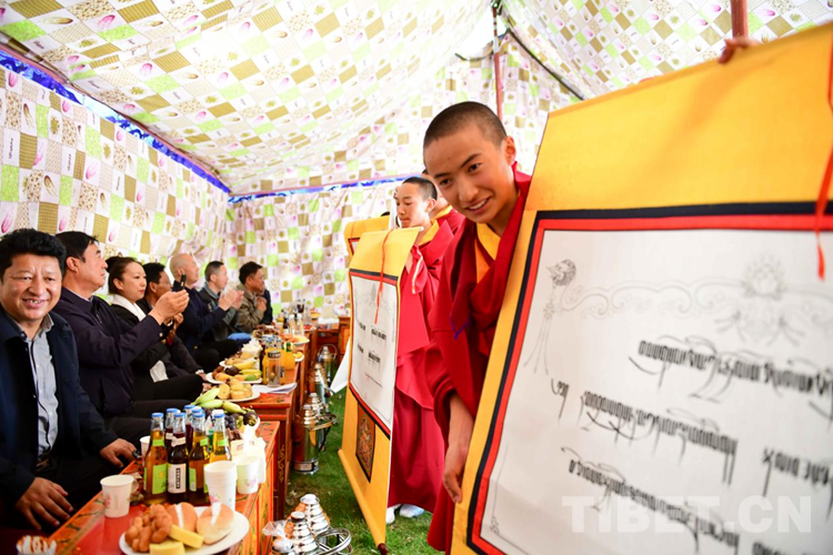 圖為佛學院老師代表相關單位向少年活佛贈送節(jié)日禮物 攝影:拉姆