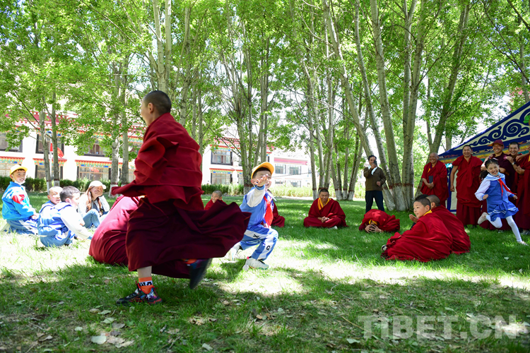 活動中,少年活佛班的學員與拉薩市第一小學的學生代表互動聯(lián)歡。少年活佛用藏、漢、英三語向大家自我介紹,朗讀自己的作文,展示了藏文書法作品。拉薩市第一小學的學生們?yōu)樯倌昊罘鹦W班表演了歌舞節(jié)目。大家載歌載舞、喜悅幸福,共度“六一”國際兒童節(jié)。