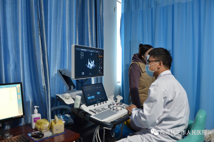 圖為林芝市醫(yī)療援藏專家正在為當?shù)厝罕娺M行先心病篩查