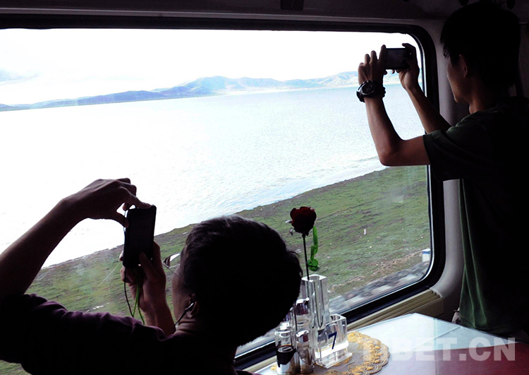 這是京藏列車在通過錯(cuò)那湖時(shí),旅客們紛紛用手機(jī)拍攝美景(唐召明2012年8月12日攝)