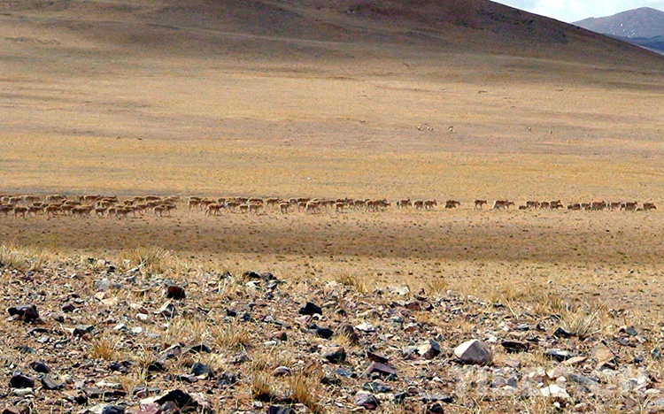 這是在羌塘國(guó)家級(jí)自然保護(hù)區(qū)成群結(jié)隊(duì)遷徙的國(guó)家一級(jí)保護(hù)動(dòng)物雌性藏羚羊(唐召明2006年攝)