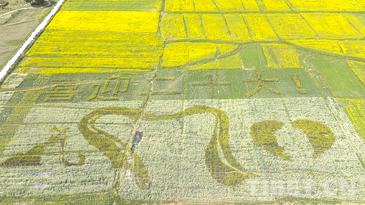 值得一提的是,在扎西崗鄉(xiāng)主會場,當(dāng)?shù)貙⒒牡刂匦麻_墾,安排種植了油菜花大地景觀。不同品種、不同顏色的油菜花海為背景的種植,從空中俯瞰形成了“喜迎二十大”“松贊故里 幸福墨竹”字樣和松贊干布、文成公主、哈達(dá)、愛心等圖樣,表達(dá)當(dāng)?shù)厝罕娤灿h的二十大的美好祝福。