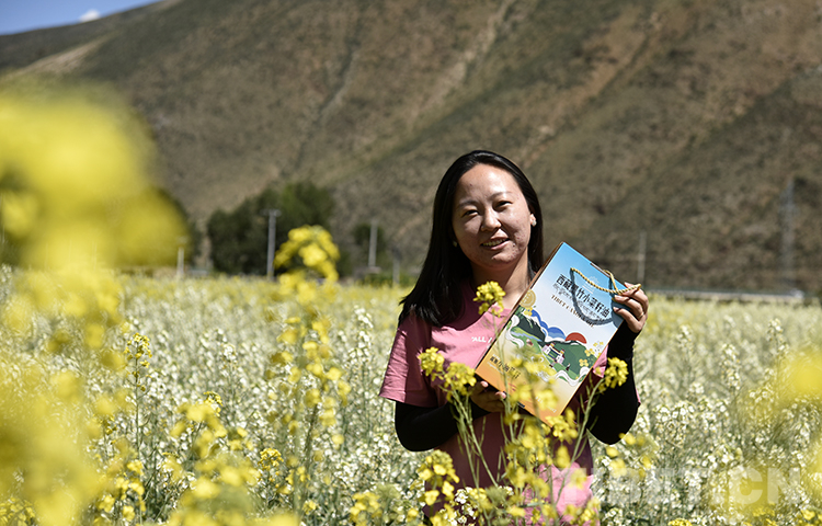 圖為墨竹工卡縣松贊文化旅游節(jié)暨第五屆油菜花節(jié)開幕式后,現(xiàn)場觀眾手捧有幸抽到的開幕式紀(jì)念品在油菜花海中留影 攝影:王媛媛