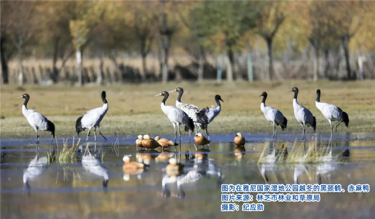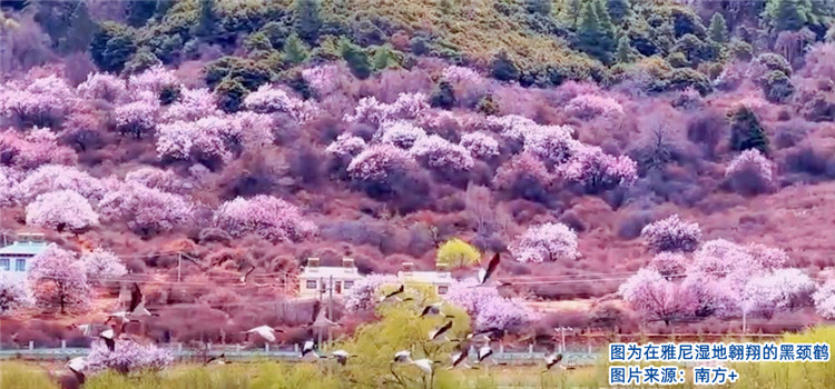 雅尼濕地生態(tài)的改善,不僅解決了困擾當(dāng)?shù)厝罕姸嗄甑娘L(fēng)沙問題,而且其高原濕地獨(dú)特的壯美景觀吸引了大批慕名而來的游客。這里已成為著名的林芝桃花的最佳觀賞地之一,尤其是黑頸鶴在此停留之時(shí),正是桃花盛開之際,灼灼其華間清啼入云,桃紅緋然間鶴舞翩躚的勝景是大自然對(duì)這里的人們矢志保護(hù)生態(tài)的回饋,更是整個(gè)西藏自治區(qū)著力生態(tài)保護(hù)成效的縮影。