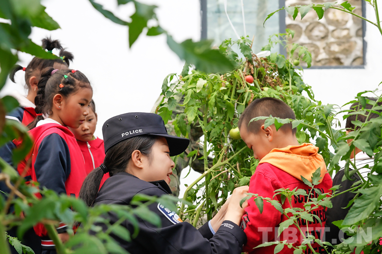 圖為亞東出入境邊防檢查站民警教龐達村雙語幼兒園小朋友分辨成熟的西紅柿