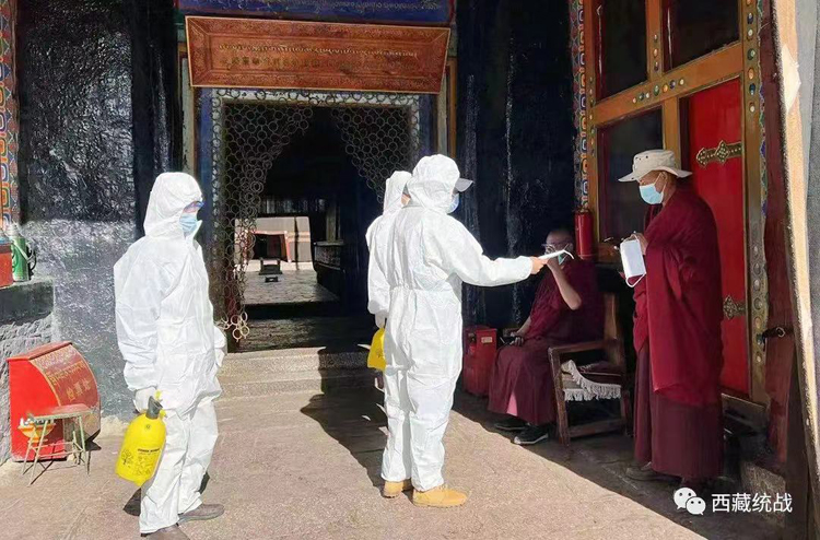 圖為西藏自治區(qū)日喀則市薩迦寺管委會(huì)在寺廟內(nèi)開(kāi)展疫情防控工作 圖片來(lái)源:西藏統(tǒng)戰(zhàn)微信公眾號(hào)