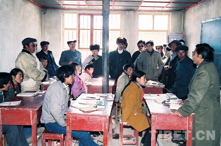 這是那曲地區(qū)“訪問團”人員在參觀文部辦事處小學(xué)(唐召明1989年12月份攝)