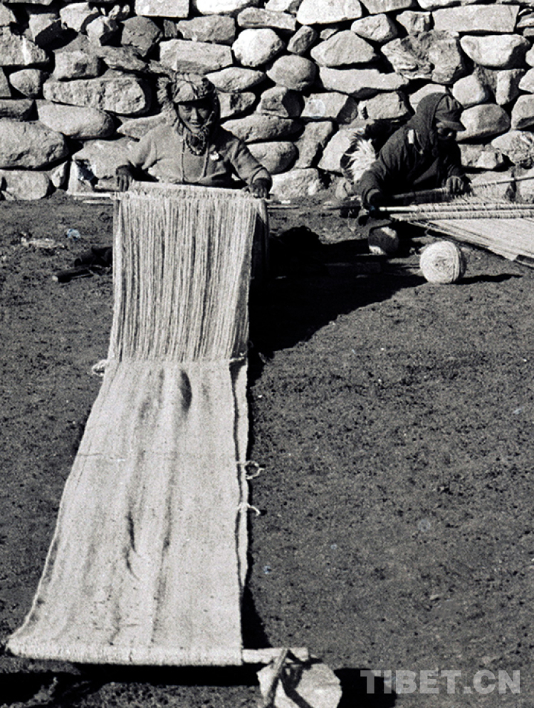 這是那曲地區(qū)雙湖辦事處(現(xiàn)那曲市雙湖縣)嘎措鄉(xiāng)一村在織氆氌的牧女(唐召明1988年攝)