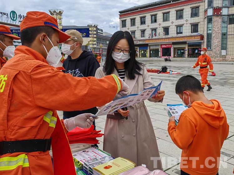 圖為消防員為過(guò)往群眾講解防滅火常識(shí)