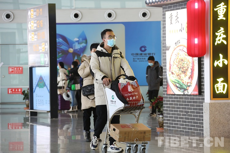 圖為在拉薩貢嘎機場內(nèi)旅客攜帶西藏特產(chǎn)準(zhǔn)備登機 攝影:王佳豪