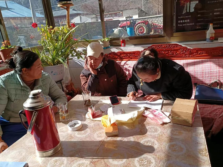 圖為亞夏(右一)協(xié)助村醫(yī)挨家挨戶收取村民醫(yī)保費用