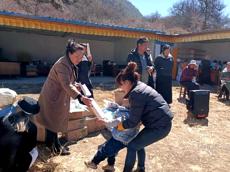 圖為亞夏(右三)在豐收節(jié)上為大家發(fā)放文體趣味活動紀念品