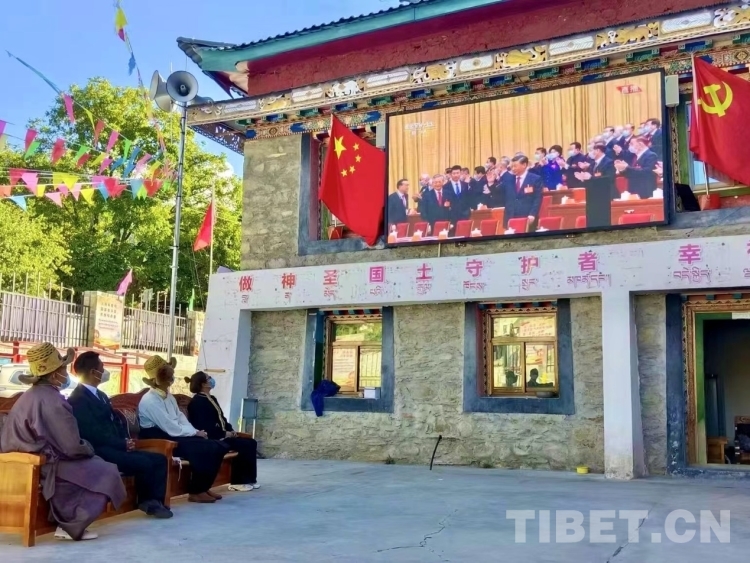 圖為西藏自治區(qū)林芝市朗縣朗鎮(zhèn)托麥村村干部通過(guò)電視大屏收聽(tīng)收看黨的二十大開幕會(huì) 圖片由林芝市委宣傳部提供