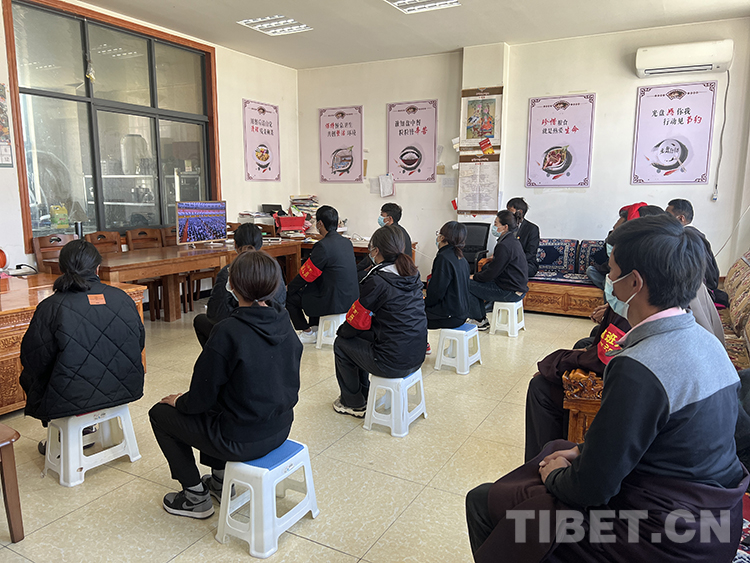 圖為西藏自治區(qū)拉薩市堆龍德慶區(qū)德慶鎮(zhèn)門堆村村“兩委”、駐村工作隊(duì)等觀看黨的二十大開幕會(huì) 攝影:鮑存根