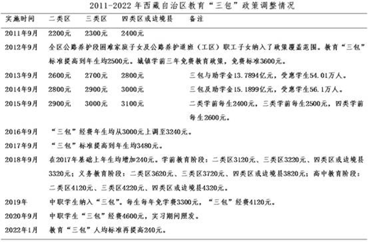 黨的十八大以來,“三包(包吃、包住、包學(xué)費(fèi))”人均標(biāo)準(zhǔn)不斷大幅提升。2012年起,西藏全面落實(shí)15年公費(fèi)教育“三包”政策。同年底,西藏“三包”年總經(jīng)費(fèi)由2008年的3.61億元增加到12.29億元,年均增幅達(dá)36%,受惠學(xué)生增加到51萬人。 到2014年,西藏“三包”經(jīng)費(fèi)增加到15.19億元,全區(qū)有52.5萬名學(xué)生受益,覆蓋面100%,實(shí)現(xiàn)了由“選擇性保障”到“覆蓋式保障”。 中央第六次西藏工作座談會后,投入力度更大。1985-2015年30年間,西藏“三包”經(jīng)費(fèi)累計投入逾80億元, 而到2020年35年投入超200億元。僅2016-2020年,西藏教育“三包”資金投入達(dá)104.74億元,年均增幅11.4%。 從1985年到2020年的35年間,西藏教育“三包”政策累計調(diào)整20次,2011-2020年的10年間,就調(diào)整了10次。2022年1月,“三包”人均標(biāo)準(zhǔn)再次提高。在比如縣,2021年底全縣享受“三包”及助學(xué)金的學(xué)生達(dá)到17771人, 占比如縣總?cè)丝诘?4.5%。