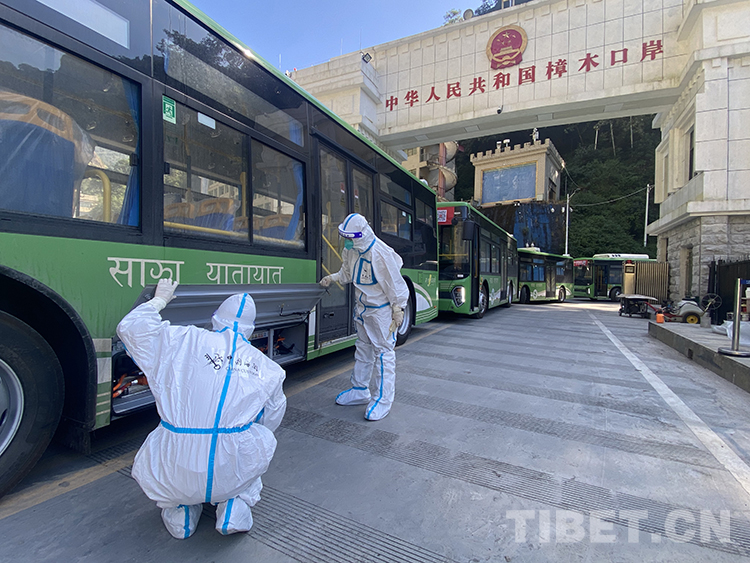圖為拉薩海關所屬聶拉木海關關員監(jiān)管國產新能源公交車出口