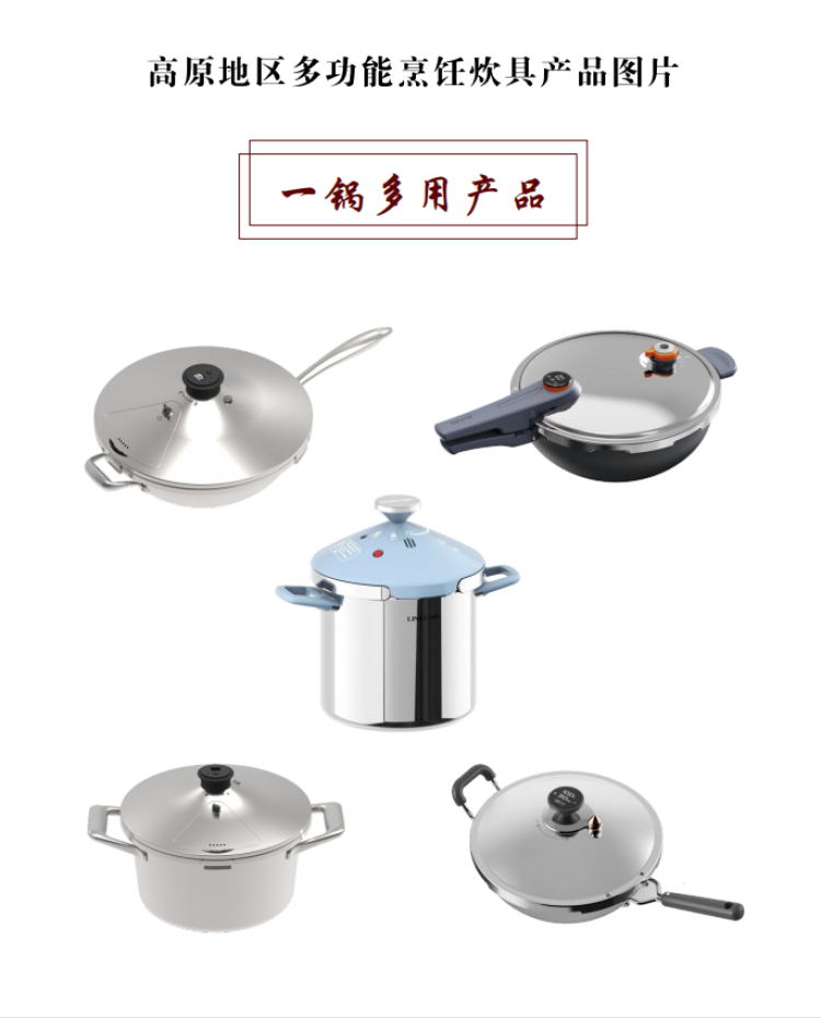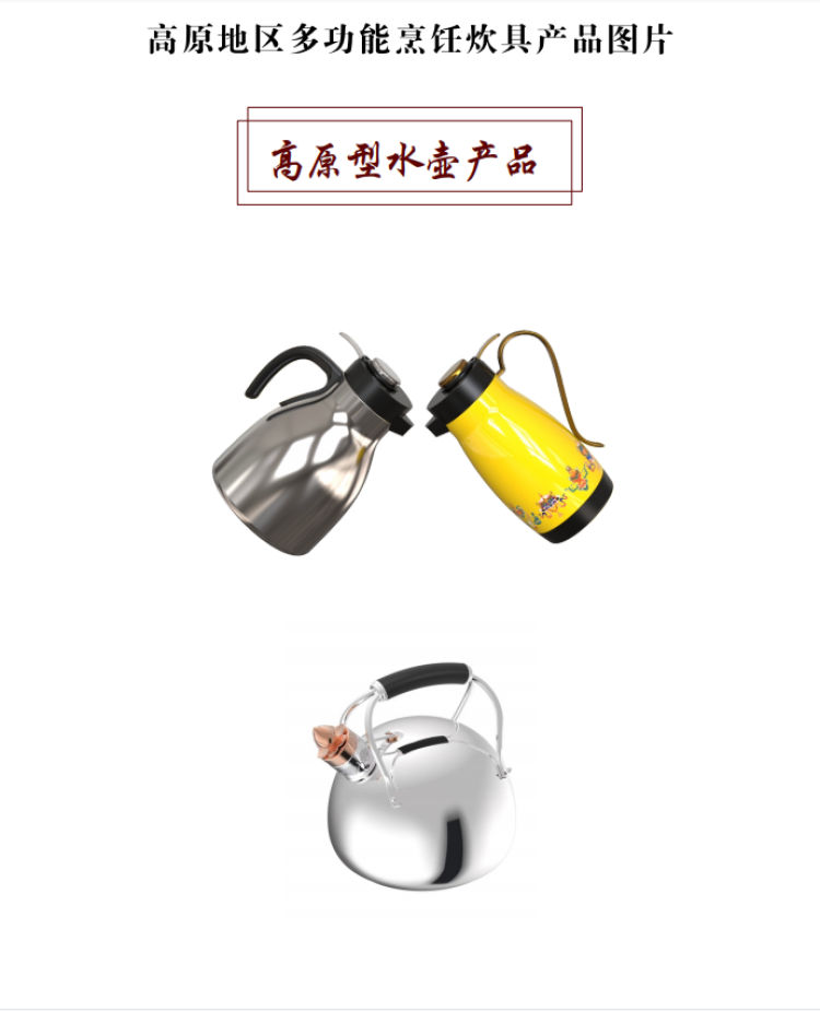 西藏自治區(qū)海拔跨度大,人民群眾生活范圍主要在800米至5000米左右,針對不同海拔高度需要不同烹飪壓力及不同烹飪時間的需求,研發(fā)的高原地區(qū)多功能烹飪炊具可實現(xiàn)一鍵調(diào)壓、多檔控壓和感溫定時功能。新研發(fā)的壓力鍋針對不同的海拔地區(qū)可以實現(xiàn)不同的壓力控制,從而在不同的沸點均能快速煮熟食物,實現(xiàn)與區(qū)外煮熟時間相同,且兼具口感,并保留食物更多的營養(yǎng)成分。新研發(fā)的高原地區(qū)專用燒水壺(明火款、電子款)也實現(xiàn)了在不同海拔地區(qū)均能與區(qū)外相同時間使壺內(nèi)水沸騰后達到100℃,從而保障高原地區(qū)廣大群眾都能喝上燒開的水。