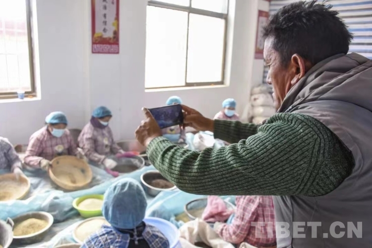 圖為瓊結縣下水村江瑟農產品專業(yè)合作社一名農牧民群眾正在蕎麥加工車間錄制小視頻上傳至“文化銀行”兌換積分