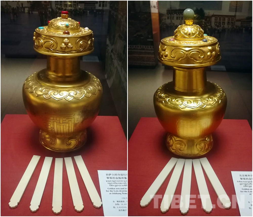 圖左為大昭寺進(jìn)行金瓶掣簽的金瓶和象牙簽(復(fù)制品),圖右為雍和宮進(jìn)行金瓶掣簽的金瓶和象牙簽(復(fù)制品)攝影:李元梅