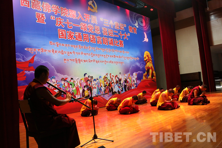 圖為2022年7月1日,西藏佛學(xué)院舉行的“慶七一頌黨恩 喜迎二十大”國(guó)家通用語(yǔ)言朗誦比賽現(xiàn)場(chǎng)由2021級(jí)學(xué)制班學(xué)員表演笛子獨(dú)奏《我愛你中國(guó)》和瑜伽表演 攝影:王佳豪