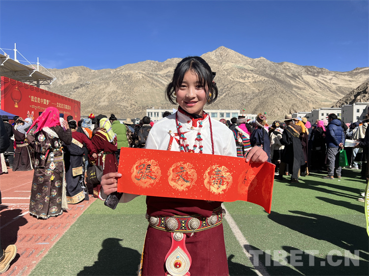 來到送“書法”現(xiàn)場,書法家們早早地來到活動現(xiàn)場,他們準(zhǔn)備筆墨、鋪開紙張,為現(xiàn)場群眾書寫藏、漢文新年對聯(lián),“?!弊?、“吉祥如意”、“扎西德勒”等寓意美好的祝福。書法家協(xié)會副主席祖牛拉巴次仁說:“從春節(jié)開始,我們書法家們?nèi)W(xué)校、社區(qū)、搬遷安置點等地,書寫了超過1萬件的書法作品。這些作品深受大家的喜愛,我們后續(xù)也會繼續(xù)開展送‘書法’公益活動”?,F(xiàn)場群眾聚集在送“書法”現(xiàn)場,“西熱措姆”“張文青”“索朗旺青”“朗嘎達瓦”……孩子們爭先恐后請書法家把自己的名字寫在紅紙上?!斑@是我的名字,我爸是西寧人,我媽是那曲的,我們是從那曲安多縣搬遷過來的,我現(xiàn)在在森布日幸福中學(xué)上初三,將來要考那曲高級中學(xué)”張文青拿著書家贈給她的“名字”用流利的那曲話對記者說。