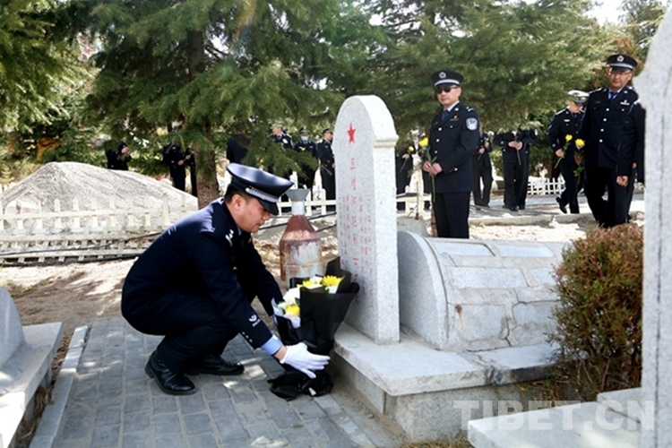 圖為西藏邊檢總站執(zhí)法調查支隊民警為旦增阿旺烈士擦拭墓碑、敬獻鮮花
