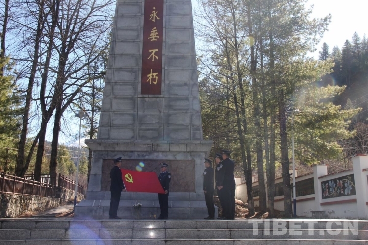 圖為西藏邊檢總站執(zhí)法調(diào)查支隊執(zhí)法調(diào)查七隊民警在亞東革命烈士陵園烈士紀(jì)念碑前對黨旗宣誓 攝影:李渠成