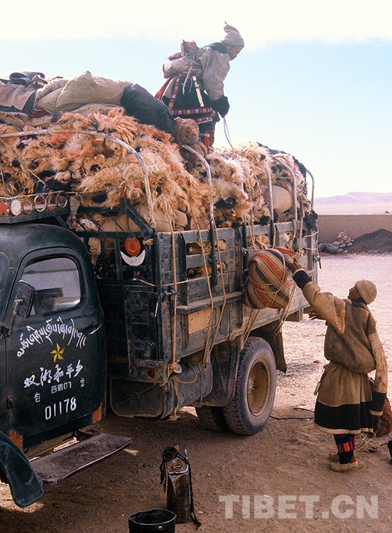 這是雙湖辦事處(現(xiàn)雙湖縣)和平鄉(xiāng)牧民正在裝車外運(yùn)所交售的牛羊皮等畜產(chǎn)品(唐召明1987年攝)