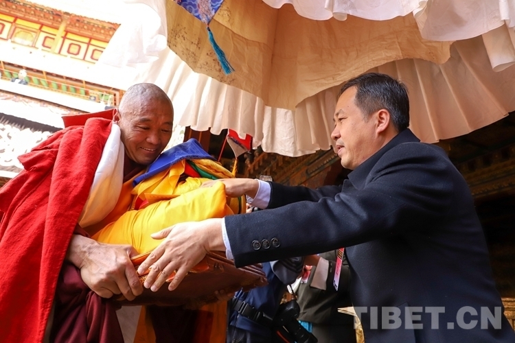 圖為西藏自治區(qū)副主席、區(qū)黨委統(tǒng)戰(zhàn)部副部長徐志濤代表西藏自治區(qū)政府向獲得學(xué)位的考僧們贈(zèng)送五彩緞、干果、袈裟和禮金。攝影:賈華加