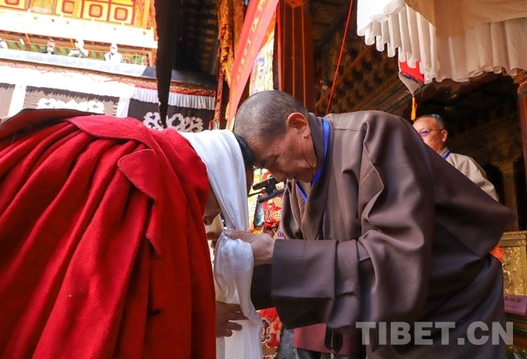 圖為西藏自治區(qū)政協(xié)副主席、佛協(xié)西藏分會常務(wù)副會長、西藏佛學(xué)院院長珠康·土登克珠向獲得學(xué)位的考僧獻(xiàn)哈達(dá)、頒發(fā)學(xué)位證書。攝影:賈華加