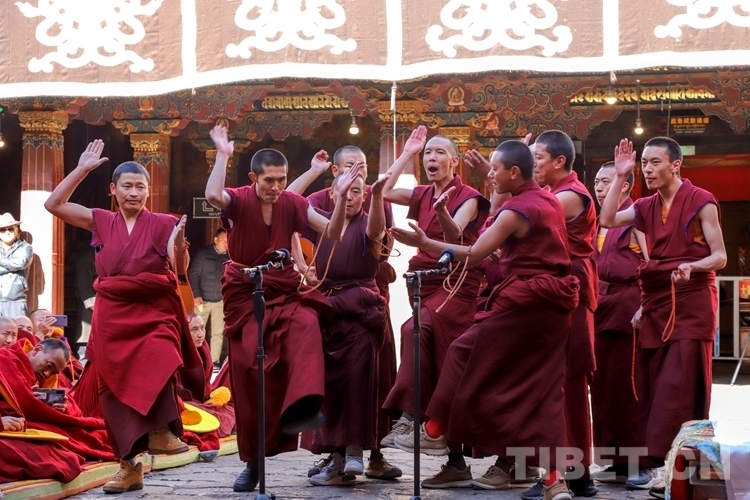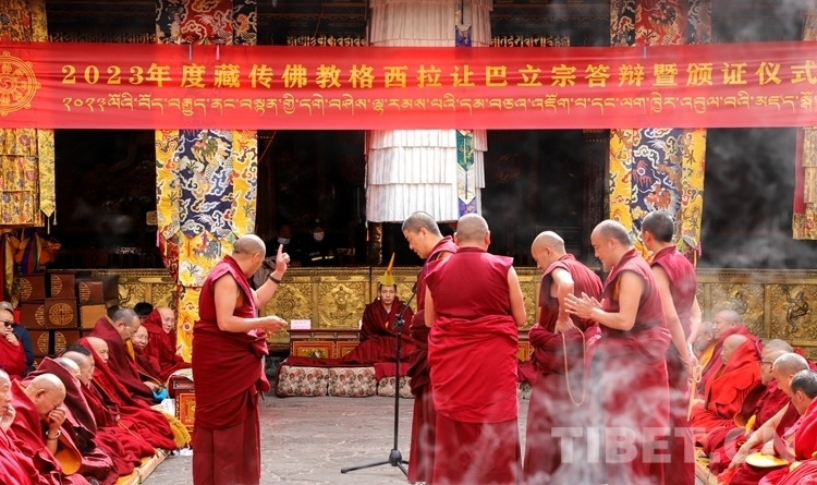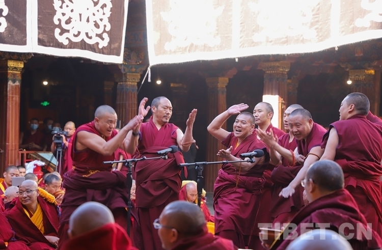 按照傳統(tǒng)慣例,在無齋佛事活動(dòng)后,在考評委員會的監(jiān)考下,通過2023年夏季預(yù)考并獲得立宗答辯資格的13名考僧輪流答辯陪考眾僧所提的有關(guān)《釋量論》《般若論》《中觀論》《俱舍論》《戒律論》五部經(jīng)典方面的內(nèi)容。