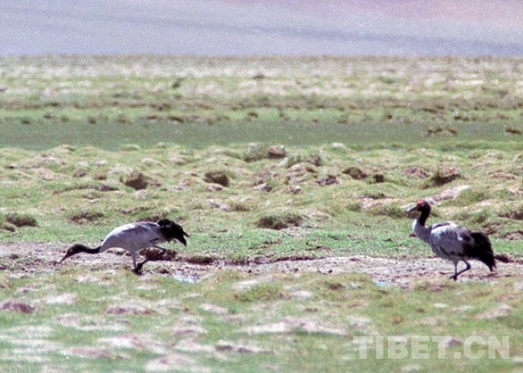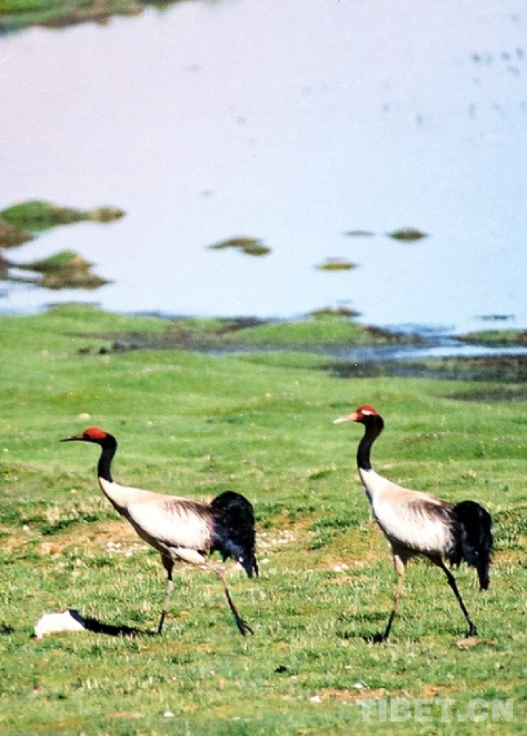 這是兩只漫步在藏北色林錯(cuò)國(guó)家級(jí)自然保護(hù)區(qū)的國(guó)家一級(jí)保護(hù)動(dòng)物、被稱為“鳥(niǎo)類(lèi)熊貓”的黑頸鶴(唐召明2001年攝)