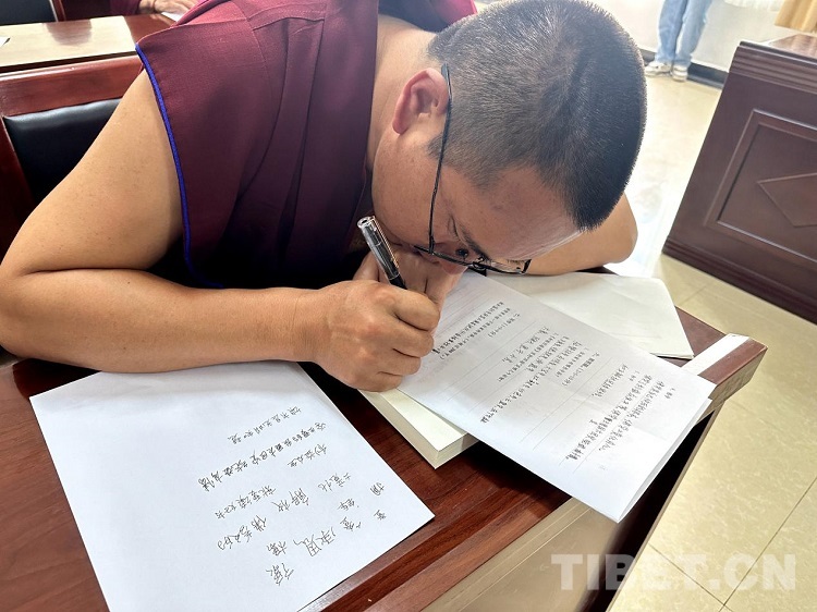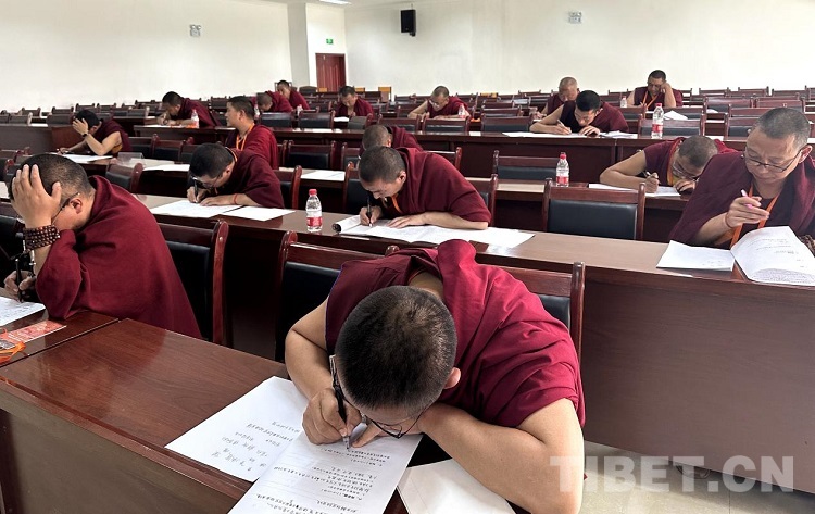 圖為中國(guó)藏語系高級(jí)佛學(xué)院2023年“拓然巴”高級(jí)學(xué)銜班招生考試(西藏)考點(diǎn)的筆試現(xiàn)場(chǎng)