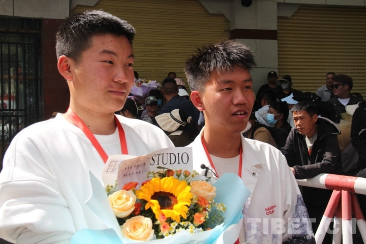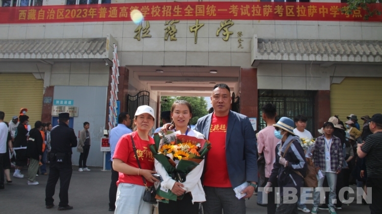 6月8日下午,在拉薩中學(xué)考場外,家長們穿著藏裝、旗袍、印有“金榜題名”“旗開得勝”等加油短袖,手捧鮮花和哈達(dá)迎接第一波結(jié)束高考的考生?!敖裉?,閨女終于要結(jié)束高中生活了,希望她能如愿考上軍校?!眲?span style="background-color: rgb(255,255,255)">先生夫婦穿著專門為女兒定制的加油短袖,備好鮮花到考場外迎接女兒。像他們一樣,考場外拿著鮮花與哈達(dá)、祝賀橫幅、勵志牌等的考生家屬和親戚漸漸多了起來。
