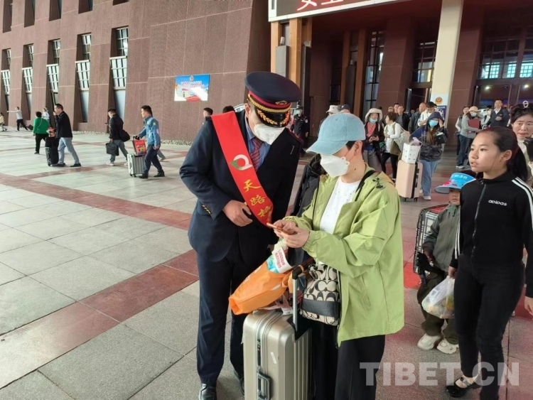 中國西藏網(wǎng)訊 2023年6月25日,拉薩火車站、林芝火車站內(nèi)異常熱鬧。在拉薩火車站,準(zhǔn)備乘坐C925次旅客列車前往林芝的旅客和車站“天路格?;ā狈?wù)隊(duì)的工作人員一起開展著競答互動小游戲,復(fù)興號列車紀(jì)念筆、車站卓瑪工作室卡通形象鑰匙扣、旅行雜志等小禮品深受旅客喜愛。在林芝火車站,工作人員和旅客跳起了熱情的鍋莊,用特有的方式慶祝拉林鐵路開通兩周年。