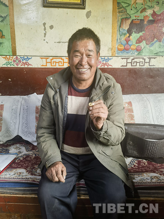 索杰醫(yī)生取出第三個包的時候,格外小心翼翼。我們因此也就更好奇,里面又是什么“寶藏”?!拔?986年入黨,1997年當村大隊的副隊長。2010年,鄉(xiāng)里在12個村的大隊長中,選兩名優(yōu)秀人員,我就是其中之一?!彼鹘茚t(yī)生邊說,邊慢慢拿出一個盒子,打開盒蓋,把手在衣服角上抹抹,然后取出一枚金黃閃亮的毛主席像章。“當時我們縣一共去了20人,先到那曲市委黨校學習了8天,然后到北京和大連分別參觀學習7天。在北京,我去了毛主席紀念堂、天安門、長城、鳥巢、水立方。我在天安門廣場買了鮮花,到毛主席紀念堂門口時,先是有點緊張,因為那里站崗的軍人。我把鮮花放在一個統(tǒng)一的地方,瞻仰毛主席遺容時,我緊張的心情一下子沒有了,都變成了激動。”索杰醫(yī)生把手放在心臟的位置比劃著,“為了紀念毛主席,我就買了一枚毛主席像章?!?/p>