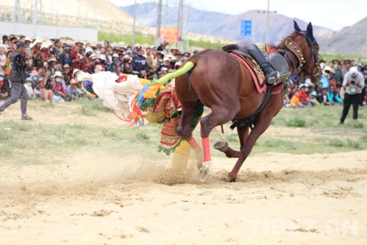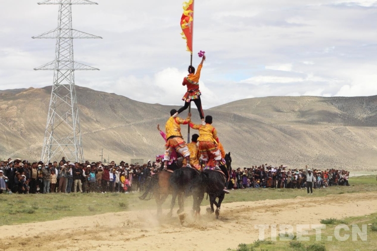 賽馬運動是藏族群眾十分喜愛的傳統(tǒng)體育運動之一,對于藏族人而言,參加賽馬和觀看賽馬能帶來好運。下午,來自西藏自治區(qū)馬術(shù)團(tuán)的選手們通過單人單馬、馬上射箭、馬上拾哈達(dá)、馬上敬酒、馬上仰背、多人多馬等表演,呈現(xiàn)了一場激動人心的馬術(shù)表演。表演期間當(dāng)選手們做出高難度的動作時現(xiàn)場觀眾神情緊張,當(dāng)選手們順利完成表演時,現(xiàn)場高聲叫好、掌聲連連。