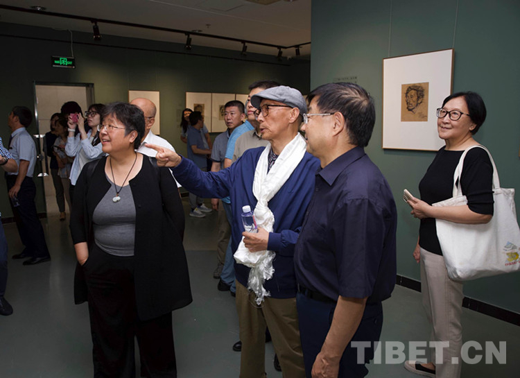 開幕式后,各位來賓在韓書力先生的引領(lǐng)解說下,興致勃勃地參觀了展覽。通過韓書力先生的講解,大家進(jìn)一步加深理解了作品所體現(xiàn)的西藏各族人民積極向上的精神面貌,體會(huì)到了各族群眾淳樸真摯的人生之美,感知到畫家對(duì)那一片高天厚土的真摯情感。