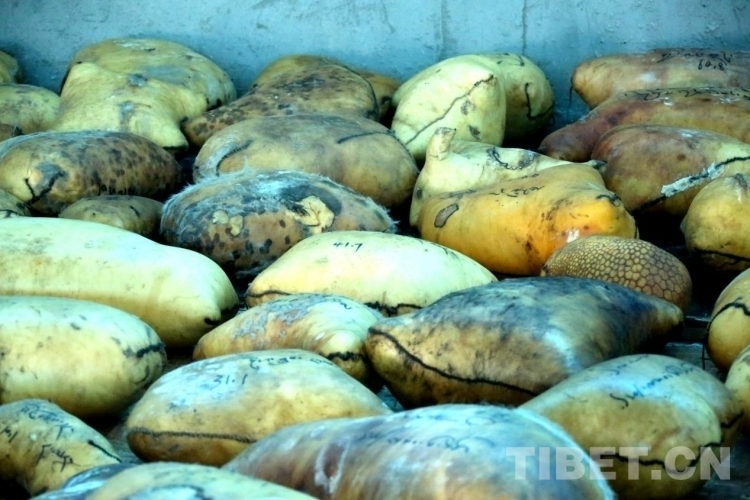 一袋袋用牛羊肚包裹的“酥油磚”整齊碼放在倉庫的一角,黃澄澄、金燦燦。每個上面寫著一串藏文,里面包含了誰家生產(chǎn)的,公斤數(shù)、生產(chǎn)日期等信息。