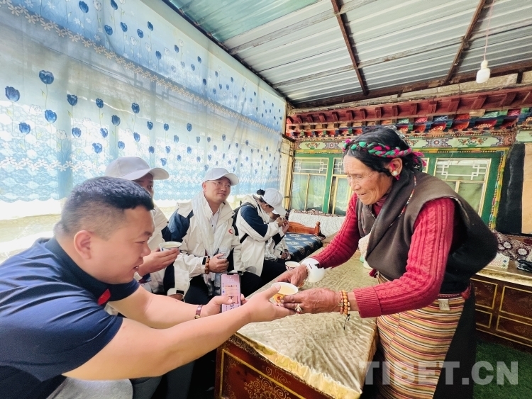 圖為慰問(wèn)困難家庭時(shí)阿媽次仁為愛心志愿者到酥油茶 攝影:德吉卓瑪